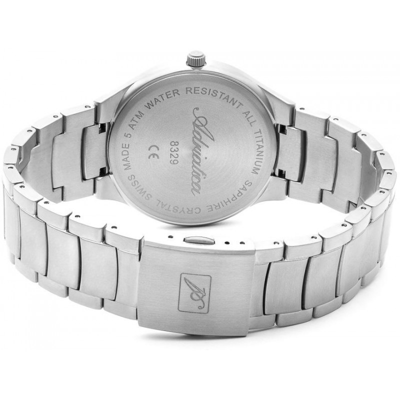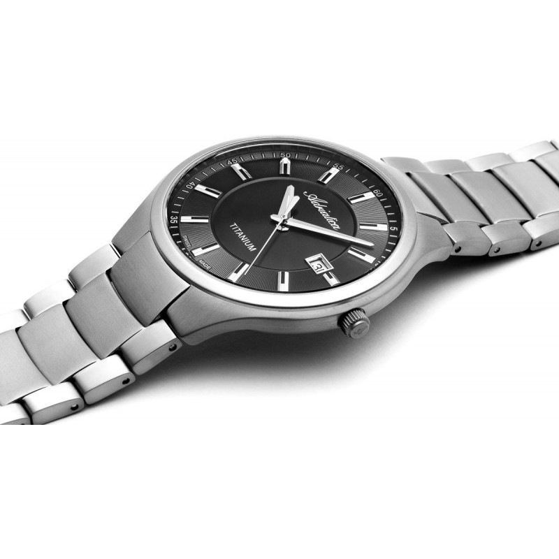 Prabangus šveicariškas vyriškas Adriatica laikrodis su įbrėžimams atspariu safyriniu stikliuku, titaniniu korpusu. Papildoma funkcija: datos langelis.