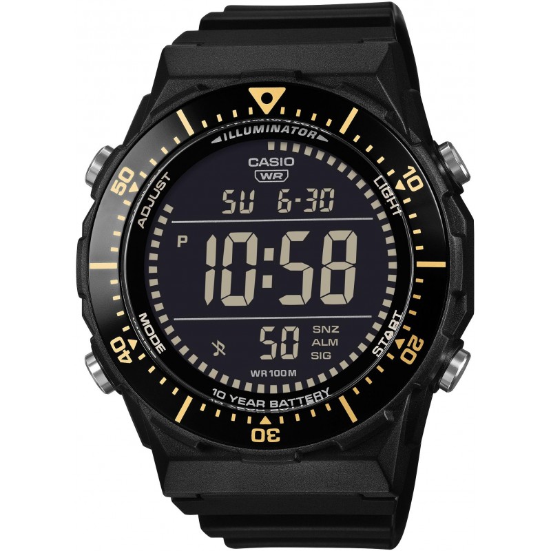 Sportinis vyriškas Casio laikrodis ypatingai atsparus vandeniui (WR 100m). Papildomos funkcijos: antras laikas, amžinasis kalendorius, chronografas, signalas kas valandą, ciferblato apšvietimas, 12/24 val.laiko formatas, snaudimo funkcija, sukiojamas laiko atskaitos žiedas, žadintuvas (5 pozicijos).