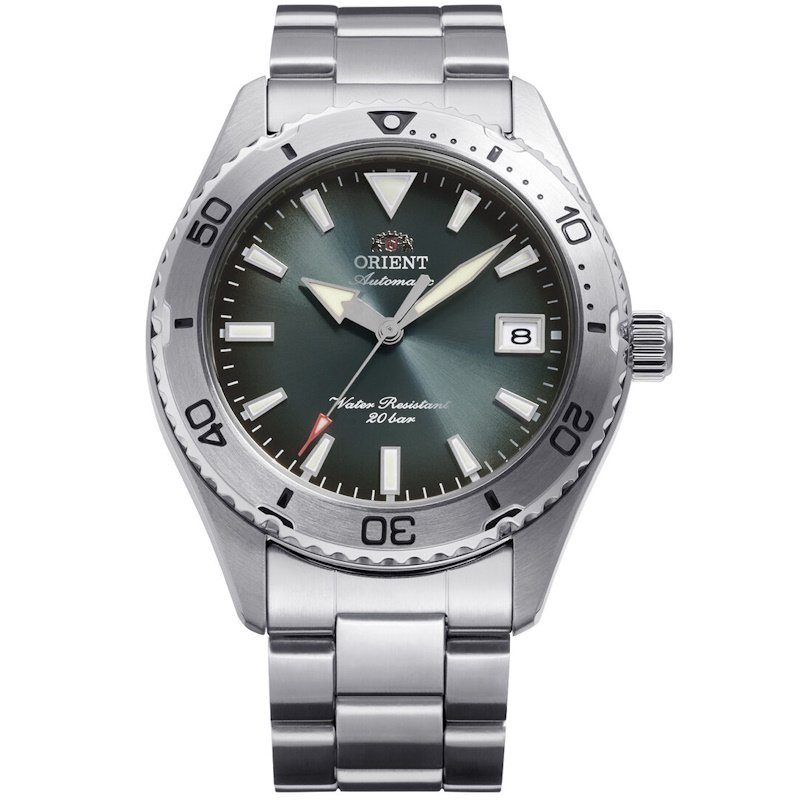 Auto-mechaninis vyriškas Orient laikrodis su įbrėžimams atspariu safyriniu stikliuku. Papildomos funkcijos: datos langelis, sukiojamas laiko atskaitos žiedas.