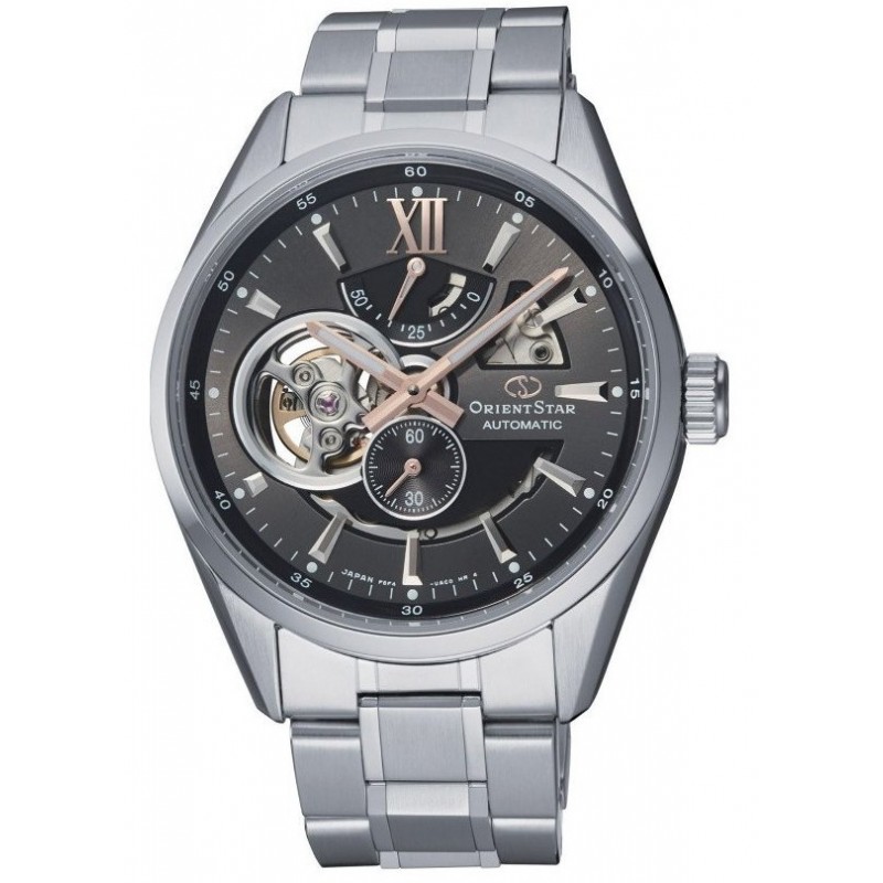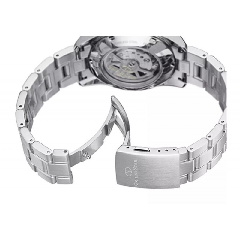 Prabangus auto-mechaninis vyriškas Orient laikrodis su įbrėžimams atspariu safyriniu stikliuku. Papildoma funkcija: energijos kiekio indikatorius.