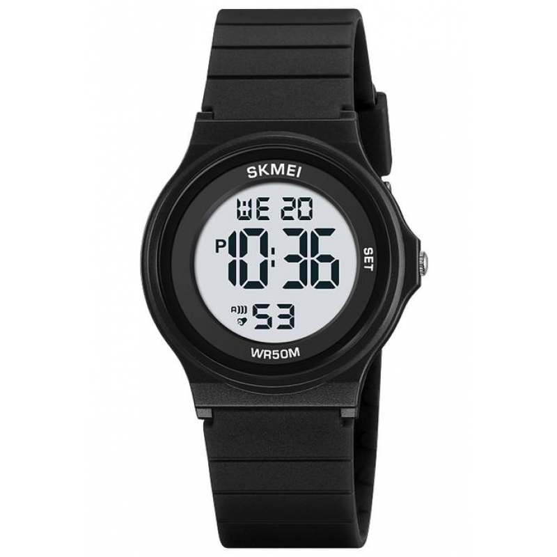 Vaikiškas Skmei laikrodis gumine apyranke. Papildomos funkcijos: apšvietimas, antras laikas, atgalinis laikmatis, kalendorius, chronografas,12/24 val laiko formatas, žadintuvas.