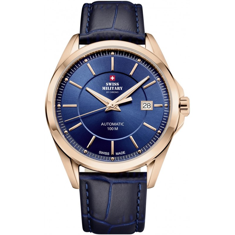 Auto-mechaninis šveicariškas vyriškas S.Military laikrodis ypatingai atsparus vandeniui (WR 100m). Papildoma funkcija: datos langelis.