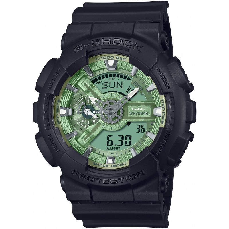 Sportinis vyriškas Casio G-Shock laikrodis atsparus smūgiams,magnetiniams laukams ir vandeniui (WR 200m). Papildomos funkcijos: apšvietimas, antra laiko juosta, amžinasis kalendorius, sportinės funkcijos, žadintuvas (5 pozicijos), pasikartojantis žadintuvo signalas, snaudimo funkcija, 12/24 val laiko formatas.