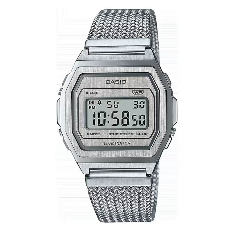 Universalus Casio laikrodis metaline pinta apyranke. Papildomos funkcijos: apšvietimas, kalendorius, laikmatis, signalas kas valandą, žadintuvas, 12/24 laiko formatas.