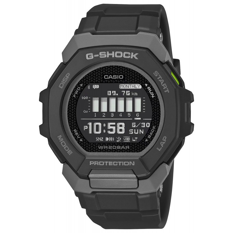 Sportinis vyriškas Casio G-Shock laikrodis atsparus smūgiams ir vandeniui (WR 200m). Papildomos funkcijos: