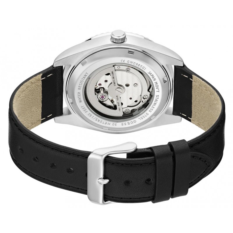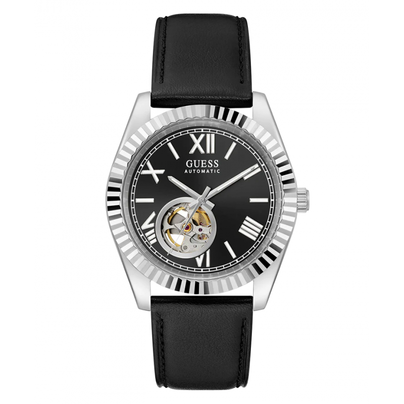 Auto-mechaninis vyriškas Guess laikrodis odine apyranke.