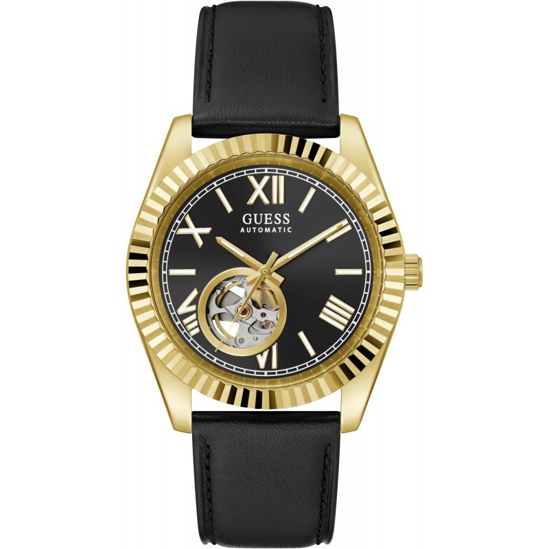 Auto-mechaninis vyriškas Guess laikrodis odine apyranke.