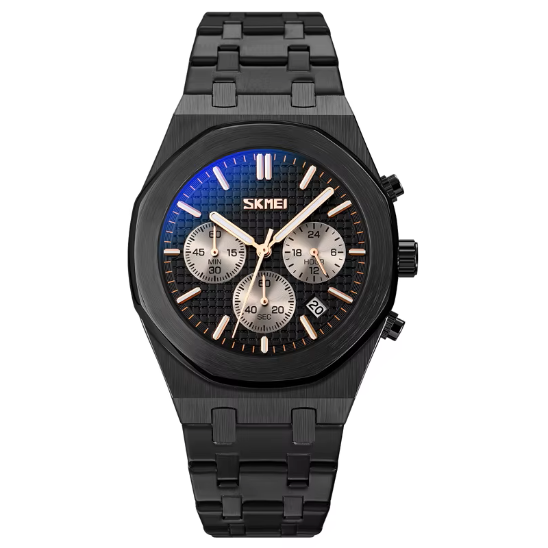 Modernus vyriškas Skmei laikrodis metaline apyranke. Papildomos funkcijos: antras laikas, chronografas, datos langelis.