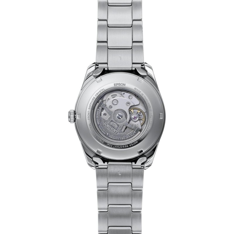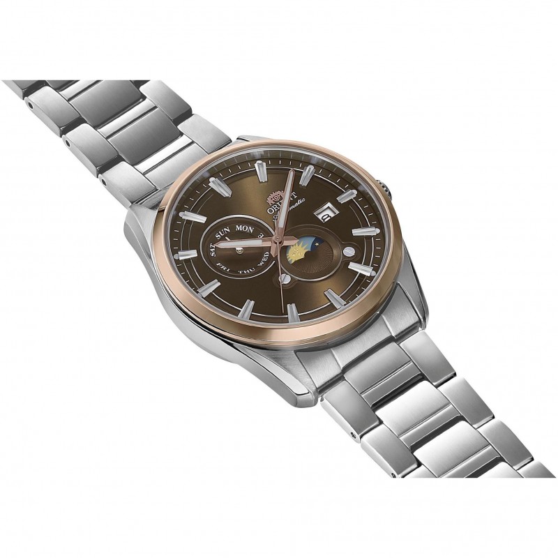 Prabangus auto-mechaninis vyriškas Orient laikrodis su įbrėžimams atspariu safyriniu stikliuku. Papildomos funkcijos: kalendorius, mėnulio fazės indikatorius.