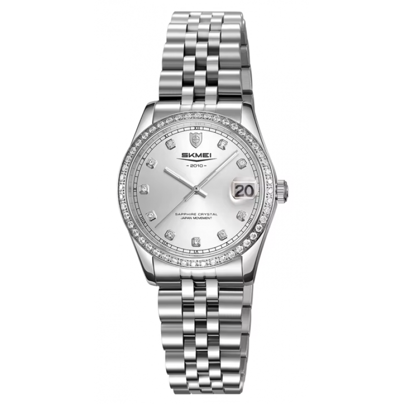 Prabangus moteriškas Skmei laikrodis su įbrėžimams atspariu safyriniu stikliuku. Papildoma funkcija: datos langelis.