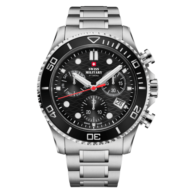 Prabangus vyriškas šveicariškas Swiss Military laikrodis atsparus vandeniui WR 100m(10 ATM). Papildomos funkcijos: chronografas, datos langelis.