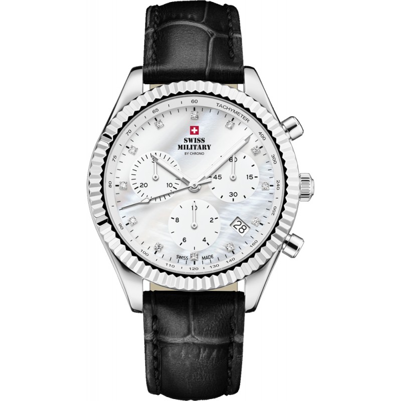 Prabangus šveicariškas moteriškas S.Military laikrodis su įbrėžimams atspariu safyriniu stikliuku. Papildomos funkcijos: antirefleksinė stikliuko danga, chronografas, datos langelis.
